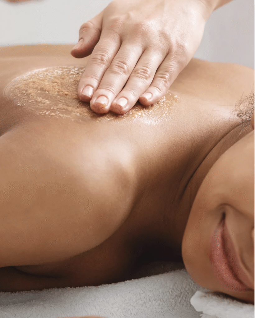 Mens du ligger og varmer deg i IR-sauna og kroppen begynner å slappe av i dybden, lager terapeuten peelingen helt fersk – kun til deg.